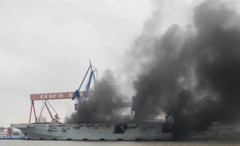 4月11日、上海の造船所に係留されていた大型強襲揚陸艦075型1番艦から出火し、船体の開口部から漏れ出た大量の黒煙が船体を覆った。